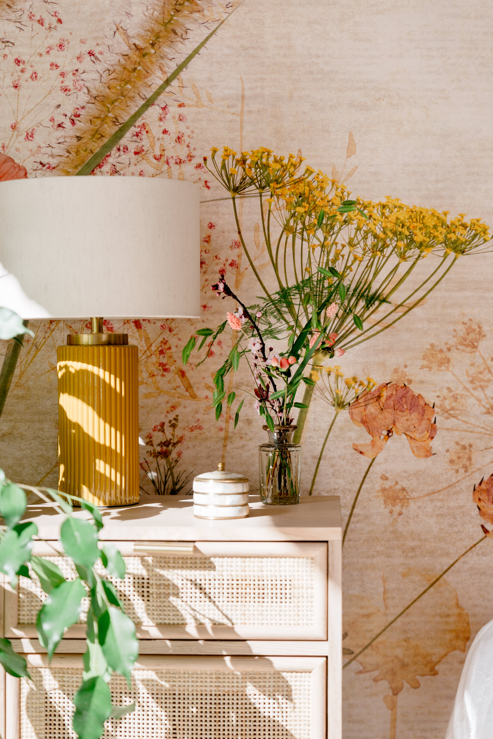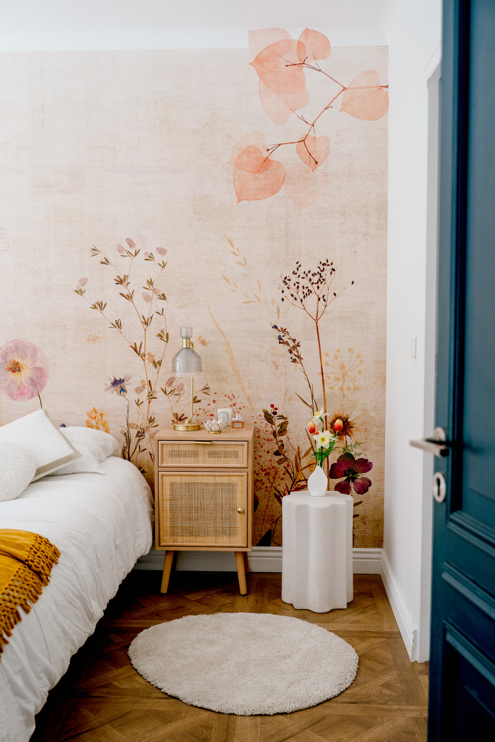 Dans cette chambre, j’ai opté pour une ambiance chaleureuse et accueillante. Une tapisserie panoramique florale a été choisie pour son pouvoir évocateur, invitant à la détente et ajoutant une touche de convivialité. Les teintes douces et colorées contribuent à créer une atmosphère confortable, offrant un refuge apaisant.